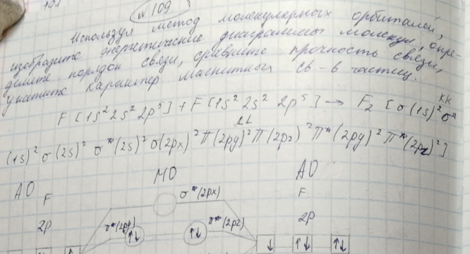 Задача 109: В задачах 101–109, используя метод молекулярных орбиталей, изобразите энергетические диаграммы молекул, определите порядок связи, сравните прочность связи, укажите характер магнитных свойств частиц.