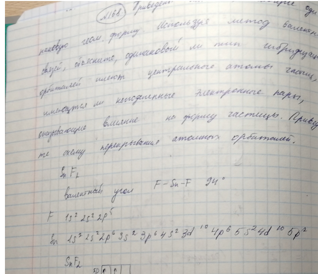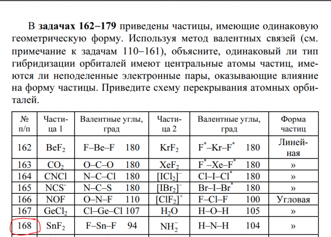 Задача 168: В задачах 162−179 приведены частицы, имеющие одинаковую геометрическую форму. Используя метод валентных связей (см. примечание к задачам 110−161), объясните, одинаковый ли тип гибридизации орбиталей имеют центральные атомы частиц, имеются