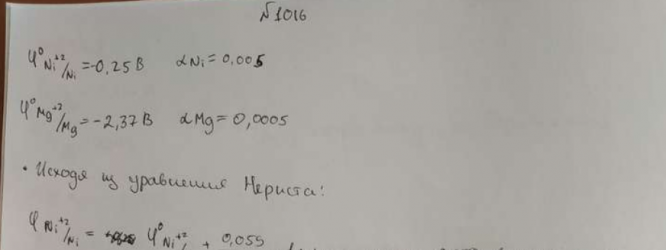 Задача 1016:В задачах 1006 – 1029 вычислите ЭДС и стандартную энергию Гиббса 0 ΔrG298 реакции, протекающей в гальваническом элементе, который образован металлами, погруженными в растворы собственных солей с известными относительными активностями ионов a. Составьте схему гальванического элемента, напишите уравнения электродных процессов и токообразующей реакции.