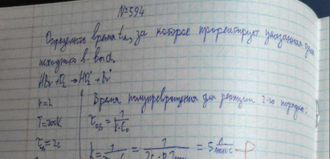 Задача 594: В задачах 581 – 595 для данной химической реакции при заданных температуре Т, порядке реакции n, начальных концентрациях реагентов С0, времени полупревращения t0,5 определите время tα, за которое прореагирует указанная доля исходного веще
