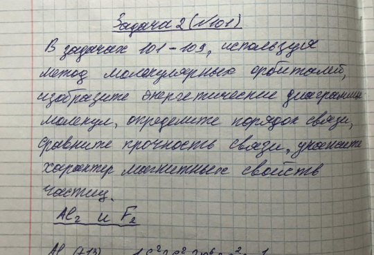 Задача 101 В задачах 101–109, используя метод молекулярных орбиталей, изобразите энергетические диаграммы молекул, определите порядок связи, сравните прочность связи, укажите характер магнитных свойств частиц