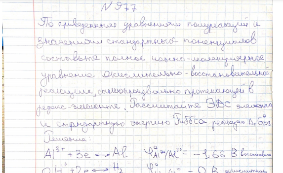 Задача 977 В задачах 967–988 по приведенным уравнениям полуреакций и значениям стандартных потенциалов составьте полное ионномолекулярное уравнение окислительно-восстановительной реакции, самопроизвольно протекающей в редокс-элементе. Рассчитайте ЭДС