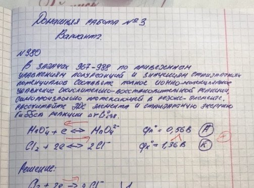 Задача 980 В задачах 967–988 по приведенным уравнениям полуреакций и значениям стандартных потенциалов составьте полное ионномолекулярное уравнение окислительно-восстановительной реакции, самопроизвольно протекающей в редокс-элементе. Рассчитайте ЭДС
