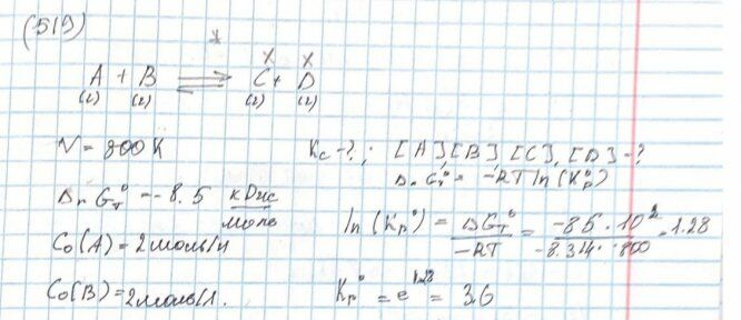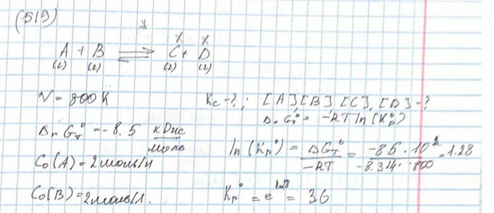 Задача 519: В задачах 506 – 521 для гомогенной реакции А + В = С + D рассчитайте константу равновесия и равновесный состав системы при температуре Т, если известны 0 Δr T G и начальные концентрации С0 исходных веществ. Продукты реакции в начальный момент времени отсутствуют.519 | 800 | -8,5 | 2 | 2 |