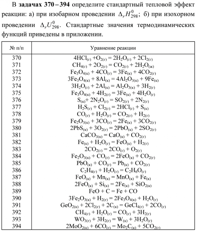 Задача 389:В задачах 370 – 394 определите стандартный тепловой эффект реакции: а) при изобарном проведении 0 298; ΔrH б) при изохорном проведении 0 298. ΔrU Стандартные значения термодинамических функций приведены в приложении.