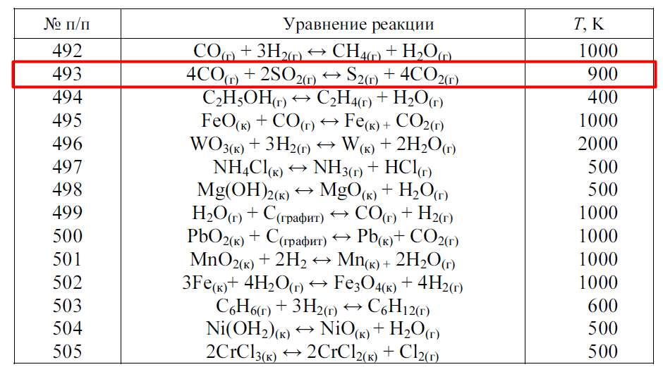 Задача 493: В задачах 481 – 505 рассчитайте стандартные энергию Гиббса 0 Δr T G и константу равновесия K0 реакции при заданной температуре. Напишите выражение константы равновесия. Укажите, в каком направлении протекает реакция при данной температур