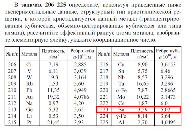 Задача 192 - Определите, используя приведенные ниже экспериментальные данные: а) структурный тип кристаллической решетки, в которой кристаллизуется данный металл (гранецентрированная кубическая, объемно центрированная кубическая или типа алмаза); б)