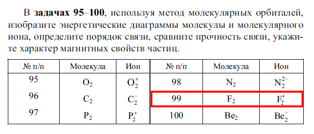 Задача 100:В задачах (95-100), используя метод молекулярных орбиталей, изобразите энергетические диаграммы