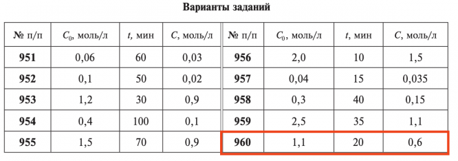 Задачи 951–960 (табл. 2.17). Рассчитайте для элементарной реакции второго порядка А + В → АВ при одинаковых начальных концентрациях реагентов С0 константу скорости реакции и время полупревращения t1/2 обоих веществ, если известно, что через некоторое время t концентрация вещества А уменьшилась до значения С.