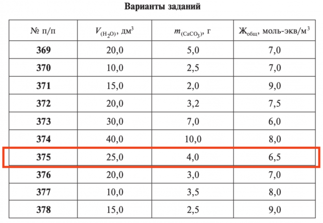 Задачи 369–378 (табл. 1.22). Рассчитайте постоянную жесткость воды, если известна общая жесткость Жобщ и масса m осадка CaCO3, образовавшегося при кипячении воды объемом V.