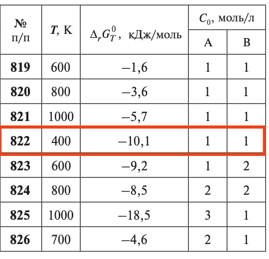 Задачи 811–826 (табл. 2.9). Для гомогенной реакции А + В = С + D рассчитайте константу равновесия и равновесный состав системы при температуре Т, если известны ∆rG0T и начальные концентрации исходных веществ С0. Продукты реакции в начальный момент времени отсутствуют.
