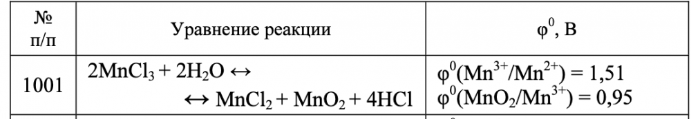 В задачах 989–1005 определите направление, в котором реакция может протекать самопроизвольно, используя окислительно-восстановительные потенциалы отдельных полуреакций, вычислите стандартную энергию Гиббса ΔrG0298и константу равновесия