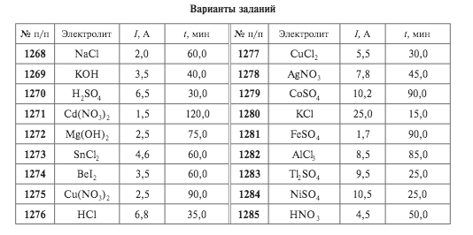 Для студентов по предмету ХимияОпределите количества веществ (массу, объем), выделяющихся на инертных электродах при известных значениях силы тока в течение времени t.Определите количества веществ (массу, объем), выделяющихся на инертных электродах при известных значениях силы тока в течение времени t.