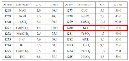 Задачи 1268–1285 (табл. 3.20). Определите количества веществ (массу, объем), выделяющихся на инертных электродах при известных значениях силы тока в течение времени t. Напишите уравнения электродных процессов. Электролиз проводится при p = 101,3 кПа и T = 298 К.