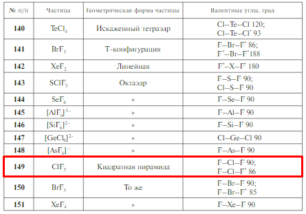 В н и м а н и е! Тип молекулы в общем виде записывается как ABmEn, где A — центральный атом, B — концевые атомы, E — неподеленные пары электронов. В случае тригональной бипирамиды (sp3d-гибридизация) неподеленные пары электронов располагаются в экваториальной плоскости, у октаэдра (sp3d2-гибридизация) — в аксиальных положениях.