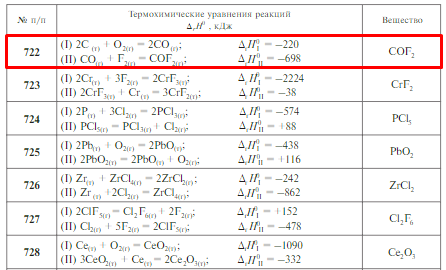 Задачи 720–732 (табл. 2.4). По заданным термохимическим уравнениям рассчитайте стандартную энтальпию образования указанного вещества.