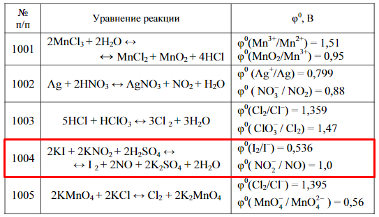 В задачах 989–1005 определите направление, в котором реакция может протекать самопроизвольно, используя окислительно-восстановительные потенциалы отдельных полуреакций, вычислите стандартную энергию Гиббса ΔrG0298 и константу равновесия реакции.