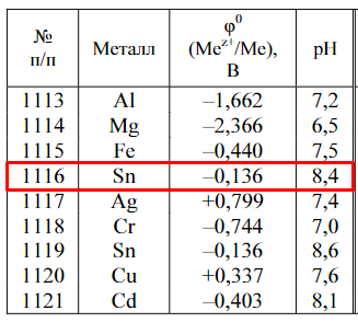 Главная » Учебные материалы » Химия » Решения задач » Несколько классов/семестров » Номер 1116 » Определите возможность коррозии металла при стандартном давлении и температуре 298 K в аэрированном водном растворе с указанным значением рН. Составьте схему коррозионного элемента, напишите уравнения электродных процессов и токоо