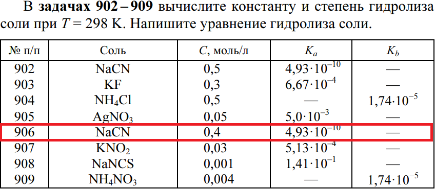В задачах 902 – 909 вычислите константу и степень гидролиза соли при Т = 298 K. Напишите уравнение гидролиза соли. Задача 906 из Ермолаева .