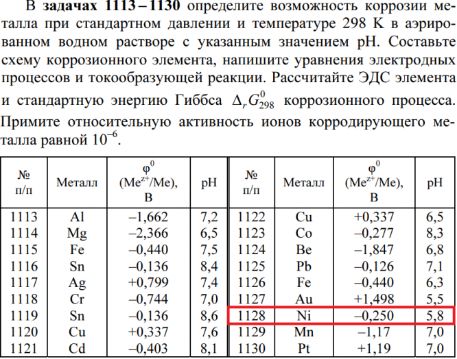 В задачах 1113 – 1130 определите возможность коррозии металла при стандартном давлении и температуре 298 K в аэрированном водном растворе с указанным значением рН. Составьте схему коррозионного элемента, напишите уравнения электродных процессов и токообразующей реакции. Рассчитайте ЭДС элемента и стандартную энергию Гиббса G коррозионного процесса. 80 Примите относительную активность ионов корродирующего металла равной 10‒6. Задача 1128 из Ермолаева.