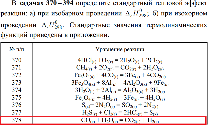 В задачах 370 – 394 определите стандартный тепловой эффект реакции: а) при изобарном проведении б) при изохорном проведении Стандартные значения термодинамических функций приведены в приложении. Задача 378 из Ермолаева.