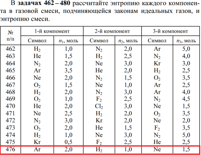 В задачах 462 – 480 рассчитайте энтропию каждого компонента в газовой смеси, подчиняющейся законам идеальных газов, и энтропию смеси. Задача 476 из Ермолаева .