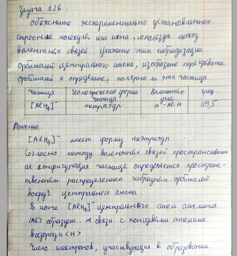 Задача 126:В задачах (110-161) объясните экспериментально установленное строение молекул или ионов, используя метод валентных связей. Укажите тип гибридизации орбиталей центрального атома, изобразите перекрывание орбиталей и определите, полярна ли эта частица.