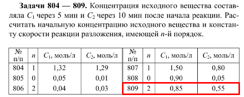 Задачи 804-809. Концентрация исходного вещества составляла С1 через 5 мин и С2 через 10 мин после начала реакции. Рассчитать начальную концентрацию исходного вещества и константу скорости реакции разложения, имеющей n-й порядок.