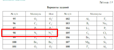 Задачи 95–108 (табл. 1.9). Используя метод молекулярных орбиталей, изобразите энергетические диаграммы молекул и молекулярных ионов, определите порядок связи, сравните прочность связи, укажите характер магнитных свойств частиц.