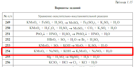 Задачи 249–289 (табл. 1.15). Подберите коэффициенты к уравнениям окислительно-восстановительных реакций, используя метод полуреакций; укажите тип ОВР и сопряженные окислительно-восстановительные пары.