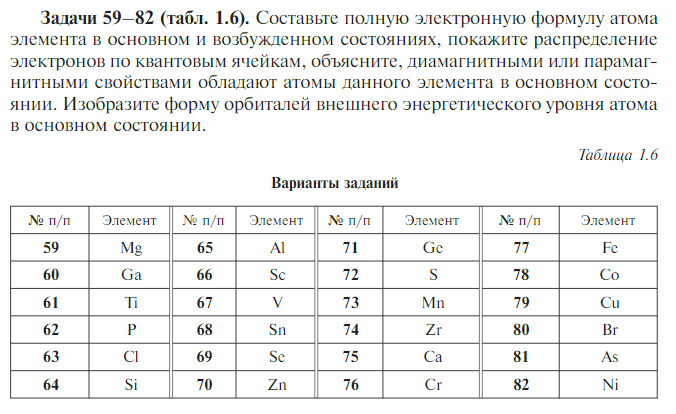 Задачи 59–82 (табл. 1.6). Составьте полную электронную формулу атома элемента в основном и возбужденном состояниях, покажите распределение электронов по квантовым ячейкам, объясните, диамагнитными или парамагнитными свойствами обладают атомы данного элемента в основном состоянии. Изобразите форму орбиталей внешнего энергетического уровня атома