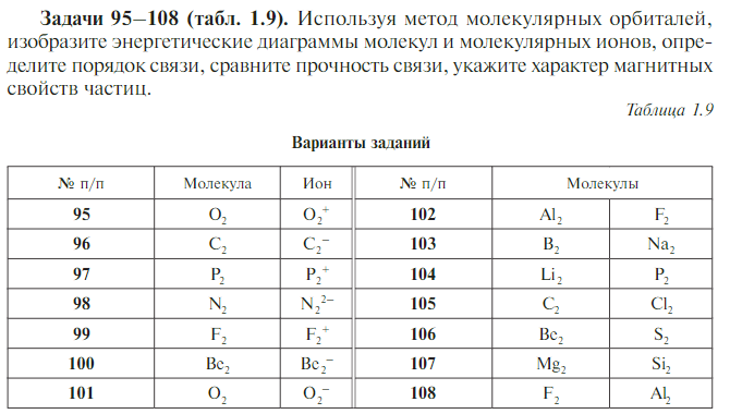 Задачи 95–108 (табл. 1.9). Используя метод молекулярных орбиталей, изобразите энергетические диаграммы молекул и молекулярных ионов, определите порядок связи, сравните прочность связи, укажите характер магнитных свойств частиц.