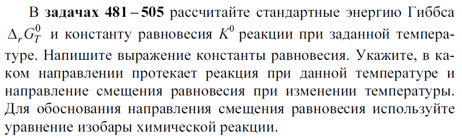 В задачах 481-505 рассчитайте стандартные энергию Гиббса и константу равновесия реакции при