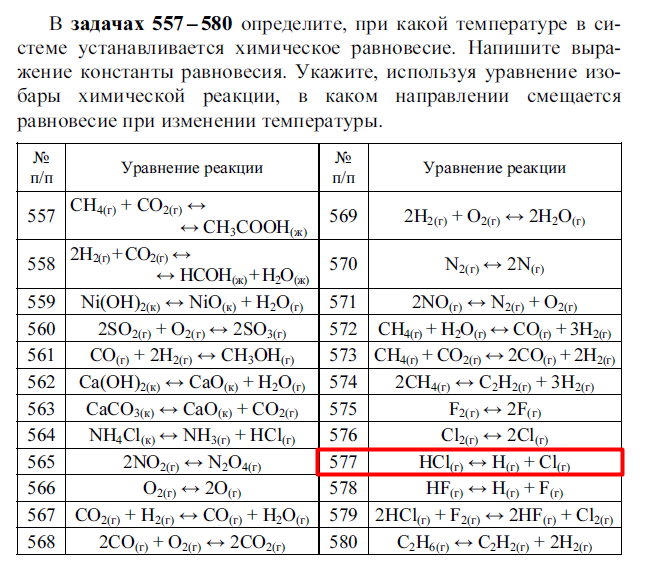 В задачах 557-580 определите, при какой температуре в система устанавливается химическое равновесие. Напишите выражение константы равновесия. Укажите, используя уравнение изобары химической реакции, в каком направлении смещается равновесие при изменении температуры.