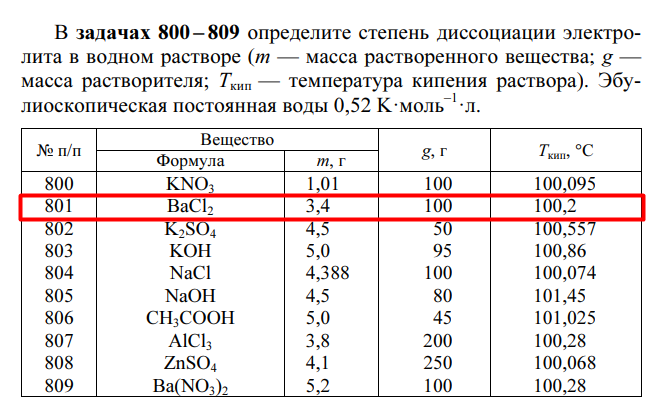 В задачах 800-809 определите степень диссоциации электролита в водном растворе. Эбуллиоскопическая постоянная воды 0,52 К*моль^(-1)л.