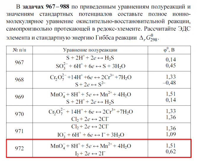 В задачах 967-988 по приведенным уравнениям полуреакций и значениям стандартных потенциалов составьте полное ионно-молекулярное уравнение окислительно-восстановительной реакции, самопроизвольно протекающей в редокс-элементе. Рассчитайте ЭДС элемента и стандартную энергию Гиббса реакции.