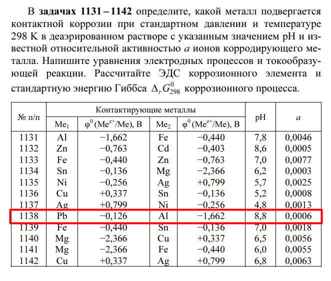 В задачах 1131-1142 определите, какой металл подвергается контактной коррозии при стандартном давлении и температуре 298 K в деаэрированном растворе с указанным значением pH и известной относительной активностью а ионов корродирующего металла. Напишите уравнения электродных процессов и токообразующей реакции. Рассчитайте ЭДС коррозионного элемента и стандартную энергию Гиббса коррозионного процесса.
