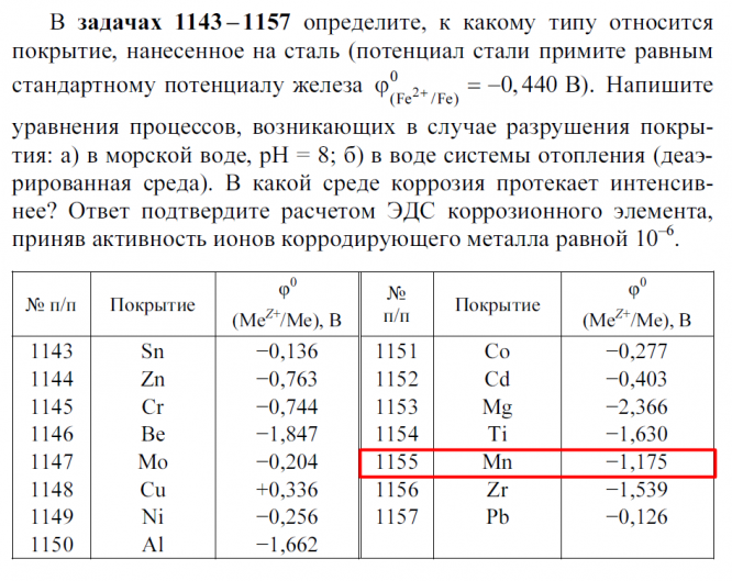 В задачах 1143-1157 определите, к какому типу относится покрытие, нанесенное на сталь (потенциал стали примите равным стандартному потенциалу железа - 0.440 В). Напишите уравнения процессов, возникающих в случае разрушения покрытия: а) в морской воде, pH = 8;
