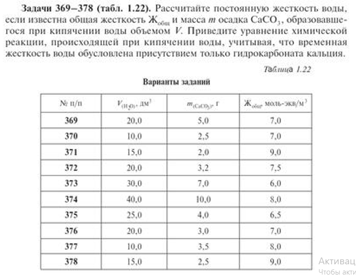 Задачи 369–378 (табл. 1.22). Рассчитайте постоянную жесткость воды, если известна общая жесткость Жобщ и масса m осадка CaCO3, образовавшегося при кипячении воды объемом V.