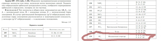 Задачи 109-151 (табл. 1.10). Объясните экспериментально установленное строение молекулы или иона, используя метод валентных связей. Укажите тип гибридизации орбиталей центрального атома, изобразите перекрывание орбиталей и определите, полярна ли эта частица. Внимание! Тип молекулы в общем виде записывается как ABmEn, где A — центральный атом, B — концевые атомы, E — неподеленные пары электронов. В случае тригональной бипирамиды (sp3d-гибридизация) неподеленные пары электронов располагаются в экваториальной плоскости, у октаэдра (sp3d2-гибридизация) — в аксиальных положениях.