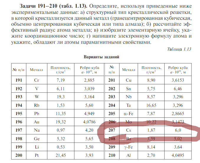 Задачи 191-210 (табл. 1.13). Определите, используя приведенные ниже экспериментальные данные: а) структурный тип кристаллической решетки, в которой кристаллизуется данный металл (гранецентрированная кубическая, объемно центрированная кубическая или типа алмаза); б) рассчитайте эффективный радиус атома металла; в) изобразите элементарную ячейку, укажите координационное число; г) напишите электронную формулу атома и укажите, обладают ли атомы парамагнитными свойствами.