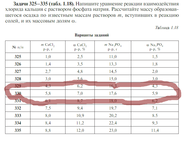 Задачи 325-335 (табл. 1.18). Напишите уравнение реакции взаимодействия хлорида кальция с раствором фосфата натрия. Рассчитайте массу образовавшегося осадка по известным массам растворов m, вступивших в реакцию солей, и их массовым долям ω.