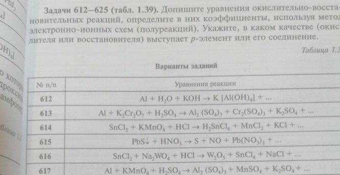 Задачи 612-625 (табл. 1.39). Допишите уравнения окислительно-восстановительных реакций, определите в них коэффициенты, используя метод электронно-ионных схем (полуреакций). Укажите, в каком качестве (окислителя или восстановителя) выступает p-элемент или его соединение.