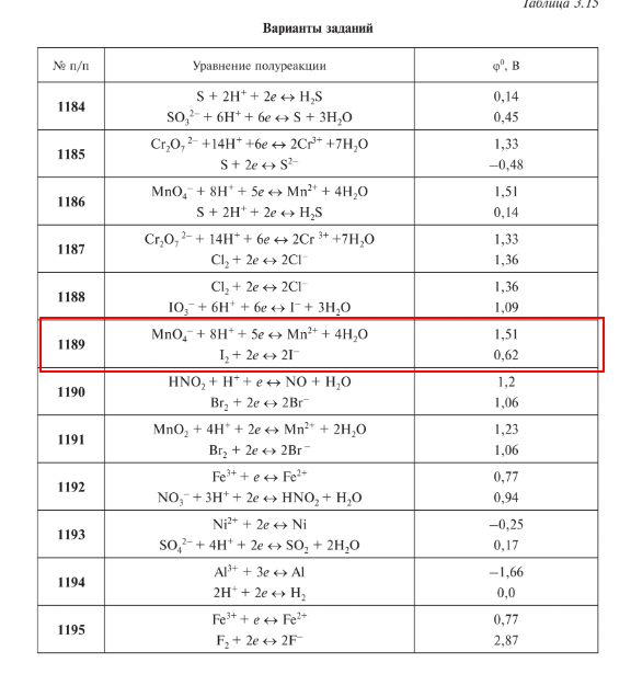 Задачи 1184–1205 (табл. 3.15). По приведенным уравнениям полуреакций и значениям стандартных электродных потенциалов составьте полное ионно-молекулярное уравнение окислительно-восстановительной реакции, самопроизвольно протекающей в редокс-элементе. Рассчитайте ЭДС элемента и стандартную энергию Гиббса реакции ΔrG0298.
