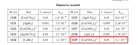 Задача 1129: Вычислите концентрации ионов, на которые диссоциирует комплексный ион в водном растворе.