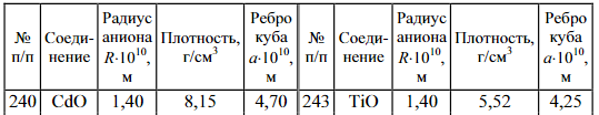 В задачах 226–245 определите, используя приведенные ниже экспериментальные данные, структурный тип кристаллической решетки, в которой кристаллизуется данное вещество (структурный тип NaCl или CsCl), рассчитайте ионный радиус катиона, изобразите элементарную ячейку, укажите координационное число катиона и аниона.