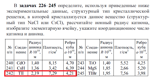 В задачах 226–245 определите, используя приведенные ниже экспериментальные данные, структурный тип кристаллической решетки, в которой кристаллизуется данное вещество (структур- ный тип NaCl или CsCl), рассчитайте ионный радиус катиона, изобразите элементарную ячейку, укажите координационное число катиона и аниона..