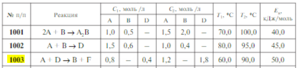 Задачи 1001 - 1010 (табл. 2.20). Рассчитайте, во сколько раз изменится скорость элементарной газофазной реакции при одновременном изменении начальной концентрации реагентов от С1 до С2 и температуры от Т1 до Т2 при известном значении энергии активации ЕА.