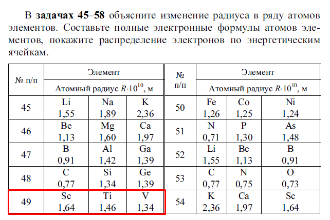 В задачах 45–58 объясните изменение радиуса в ряду атомов элементов. Составьте полные электронные формулы атомов эле- ментов, покажите распределение электронов по энергетическим ячейкам..