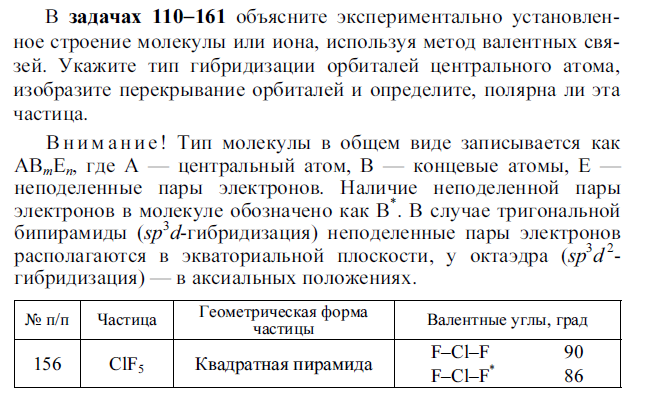 В задачах 110−161 объясните экспериментально установлен- ное строение молекулы или иона, используя метод валентных свя- зей. Укажите тип гибридизации орбиталей центрального атома, изобразите перекрывание орбиталей и определите, полярна ли эта частица. 40 Вн има н и е ! Тип молекулы в общем виде записывается как ABmEn, где A — центральный атом, B — концевые атомы, E — неподеленные пары электронов. Наличие неподеленной пары электронов в молекуле обозначено как B*. В случае тригональной бипирамиды (sp3d-гибридизация) неподеленные пары электронов располагаются в экваториальной плоскости, у октаэдра (sp3d 2- гибридизация) — в аксиальных положениях..